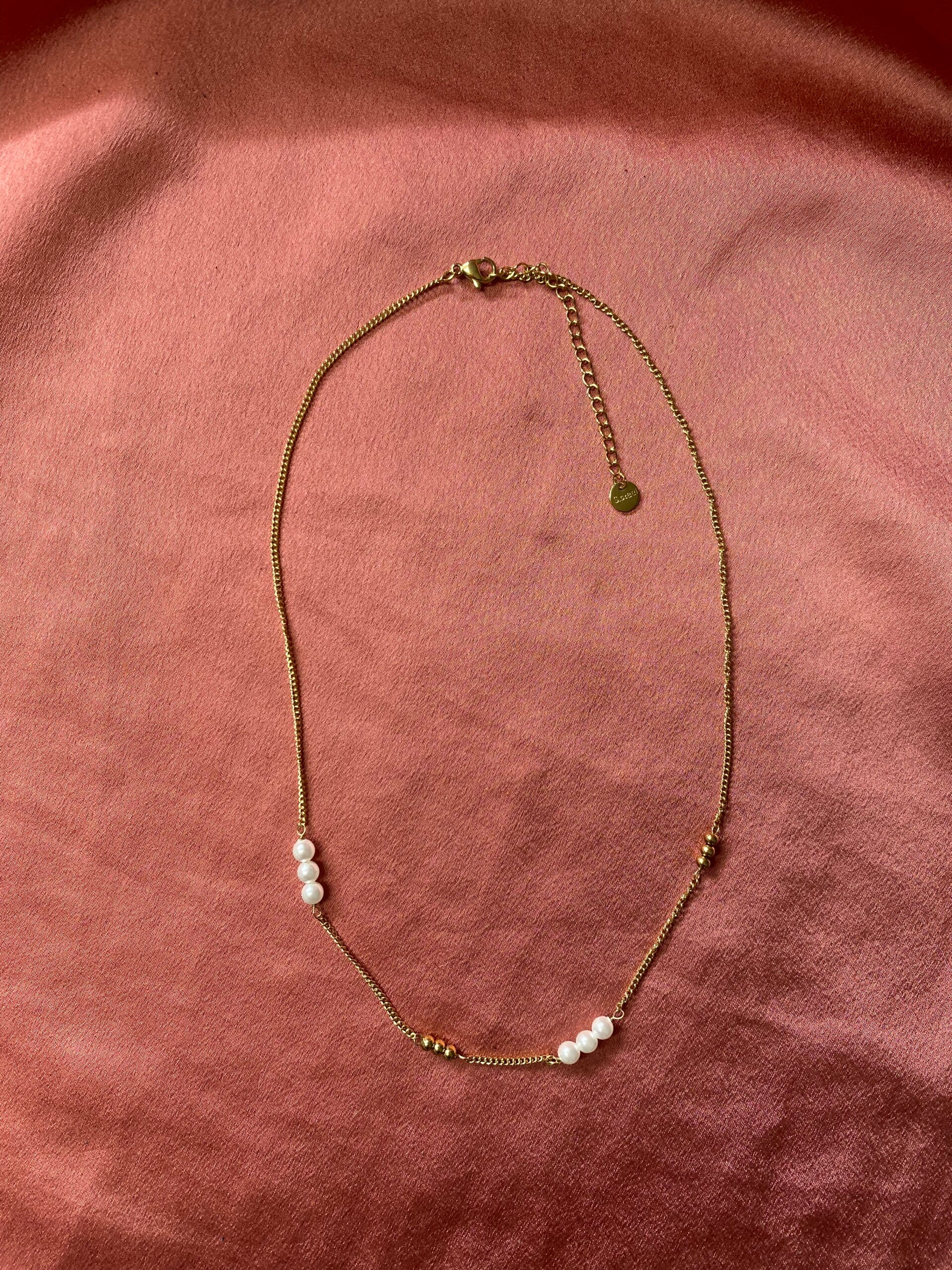 Korte ketting van stainless steel en parels.